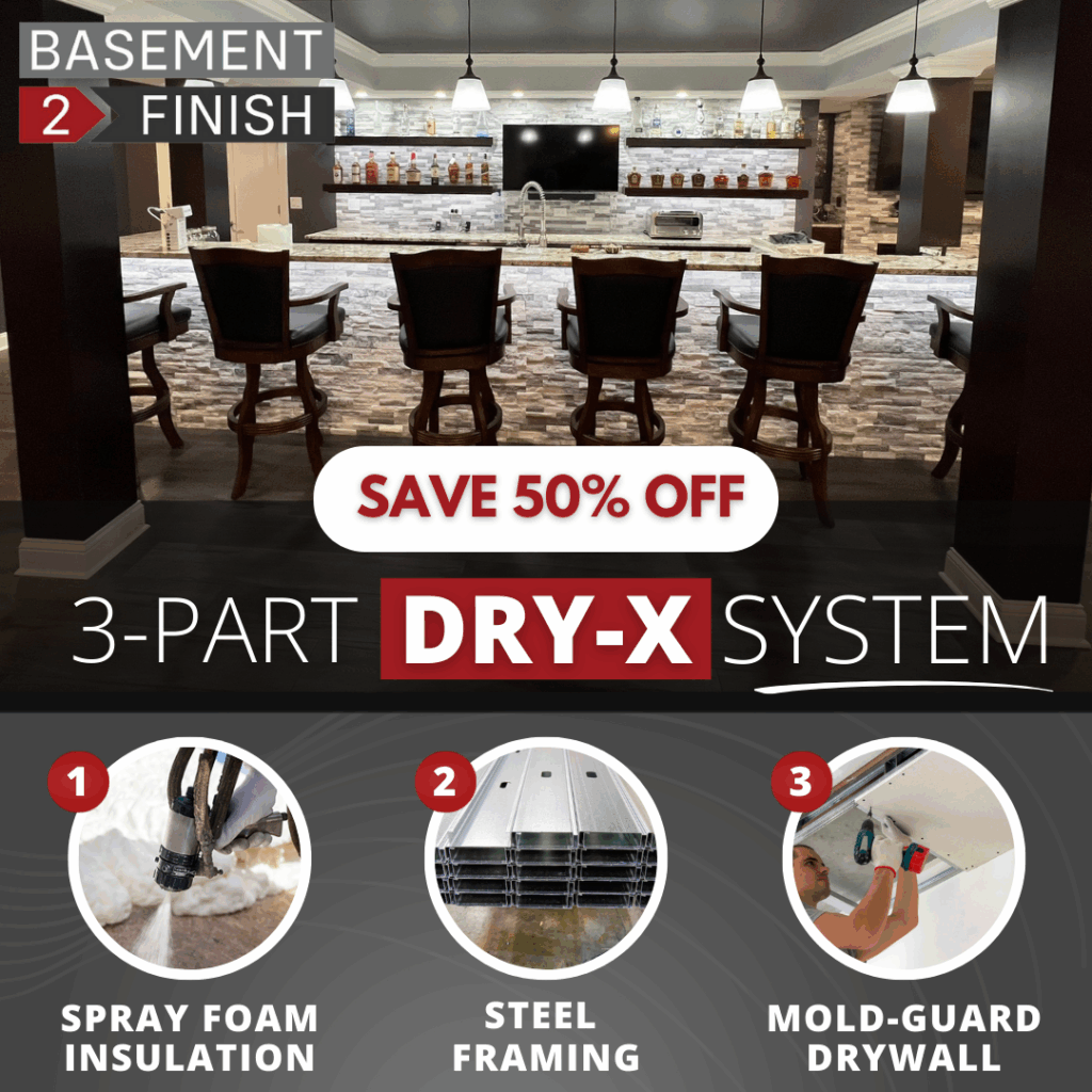 Save BIG on your basement project with our deluxe 3-Part DRY-X System, designed for homeowners who want real moisture protection and energy savings. This complete solution helps protect your home from mold, mildew, and unwanted moisture while creating a more comfortable, energy-efficient space. The DRY-X System includes steel framing, spray foam insulation, and mold-resistant drywall—everything you need to build a stronger, drier basement.
